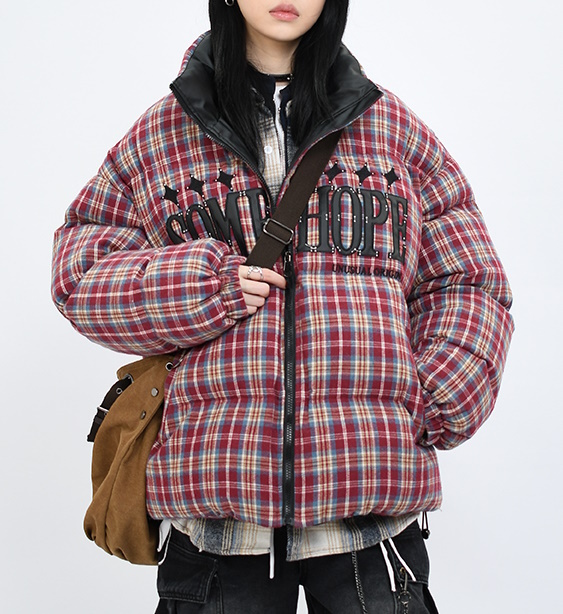 heck pattern logo embroidery stand collar down jacket bread coat acket blouson ユニセックス 男女兼用チェック柄ロゴ刺繍スタンドカラーダウンジャケットブレッドコート