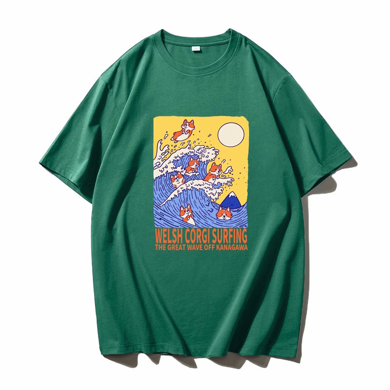 Ukiyo-e Surf Dog Round Neck T-Shirt ユニセックス男女兼用浮世絵サーフドッグプリント半袖 Tシャツ