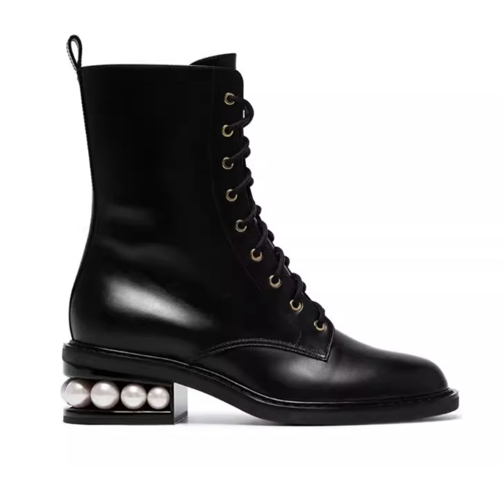 Women's Leather Pearl Casati Combat Laceup Boots 本革 ブラック パール コンバット ブーツ ショートブーツ ブーティー