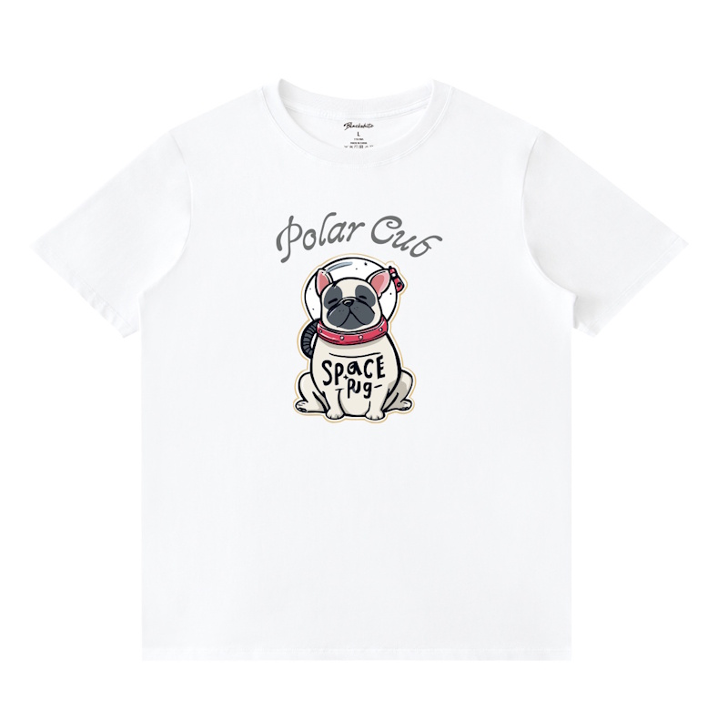 Unisex black white Space Pug Astronaut Print T-shirt 男女兼用 ユニセックススペースパグ宇宙飛行士プリント 半袖 Tシャツ
