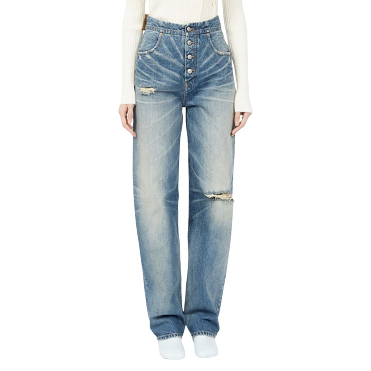 Women’s four-button high-waisted Damage Barrel leg jeans denim pants 4つボタン ハイウエスト ブレスト ダメージ加工 バレルレッグ ワイド デニムパンツ ジーンズ