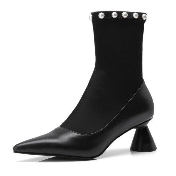 women'spearl rivet pointed patent leather ankle bootsストレッチソックスパール付きヒールショートブーツ ブーティ
