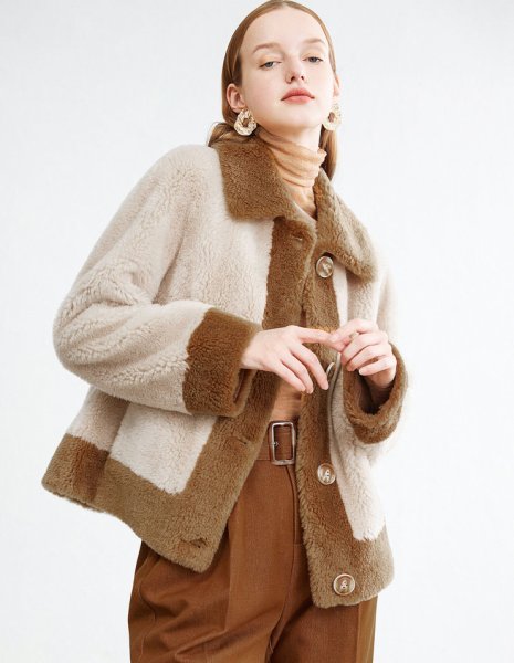 Women's Contrast Grain Fleece Single-Breasted Short Coat Jacket Coat バイカラーシープスキンハーフコート ジャケット