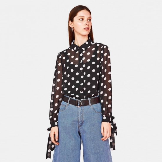 ドット水玉プリント袖口帯ボウ付きブラウス シャツ