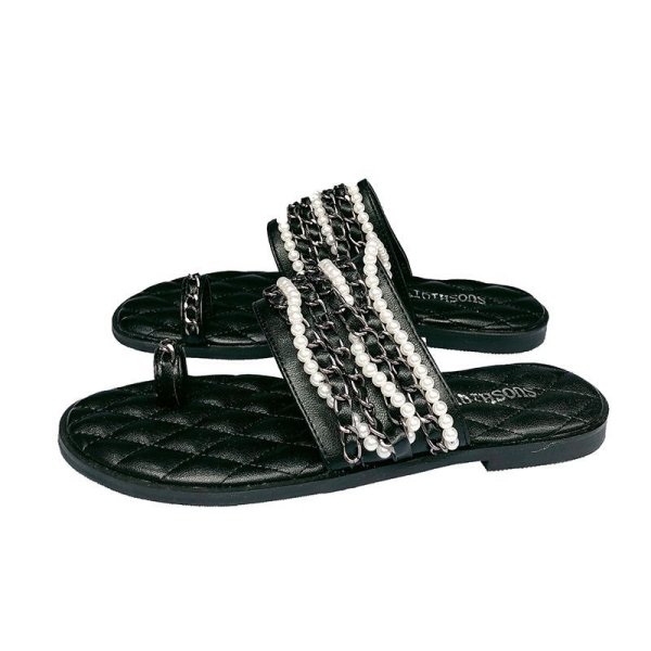 women's pearl chain flat sandals パール&チェーン付きフラットサンダル スリッパ