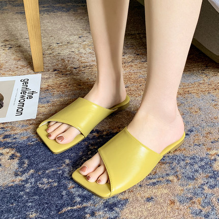 Women flat bottom open-toe square scalp leather sandals and slipper フラットオープントゥスクエアサンダル スリッパ