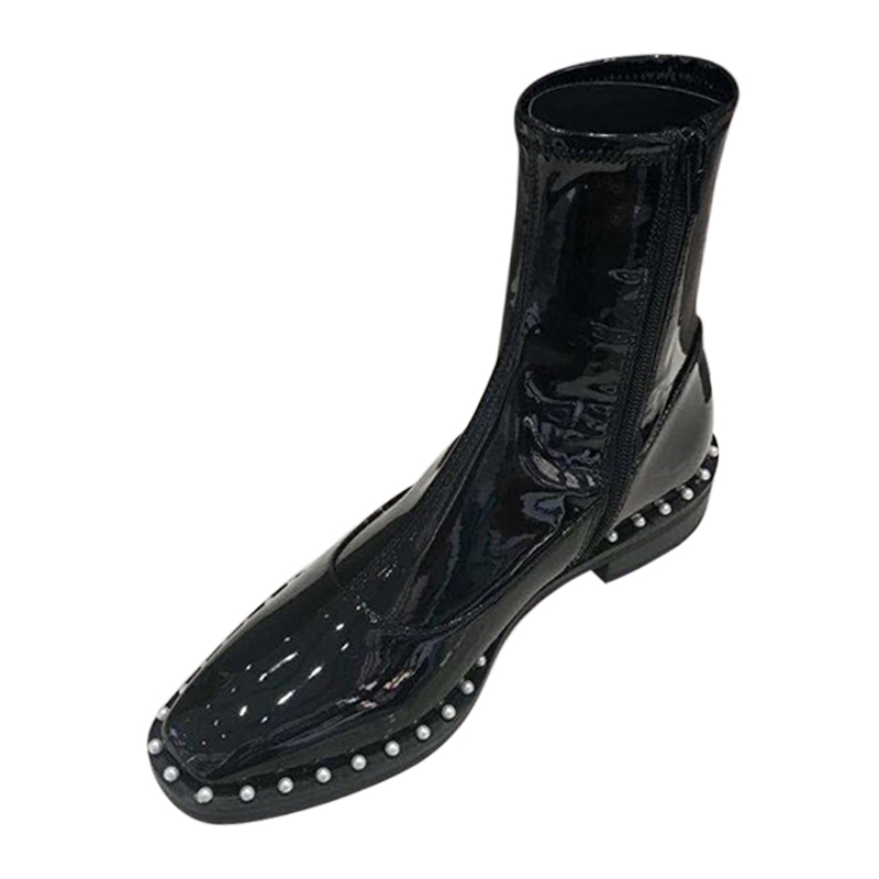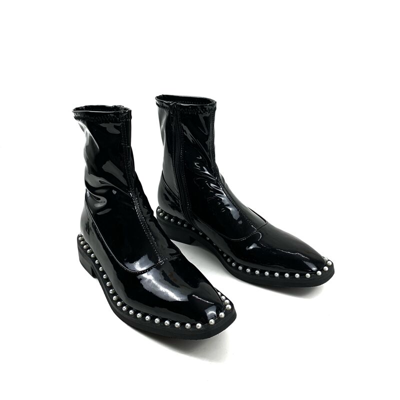 women's patent leather Chelsea boots Martin boots パテントレザー&スウェード パールデコレーション スクエアトゥマーティンブーツ