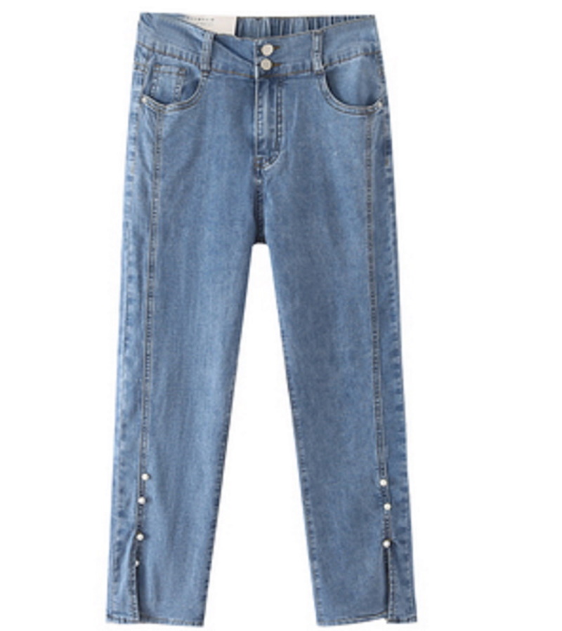 waist double-button elastic pearl slit denim nine-point pants denim Pants jeans ウエストダブルボタンパールスリット9分丈デニムデニムパンツ ジーンズ