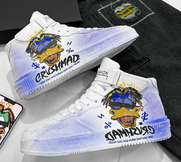Men's black donald duck print High Cut leather lace-up sneakers 男女兼用ユニセックスブラックドナルドダックハイカットレザーレースアップ スニーカー