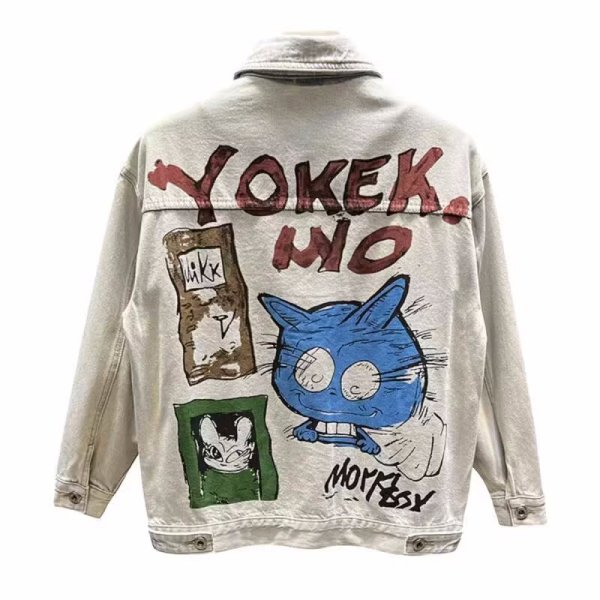 このデニムジャケットの最大の特徴は、前面に施されたキャット&マウスのグラフィティプリントです。ユニークで遊び心あふれるデザインが、どこか懐かしさを感じさせるレトロな雰囲気を醸し出しています。アートが好きな方や、流行に敏感な方には特に気に入っていただけることでしょう。プリントは高品質なインクを使用しており、色あせや剥がれに強いのが嬉しいポイントです。